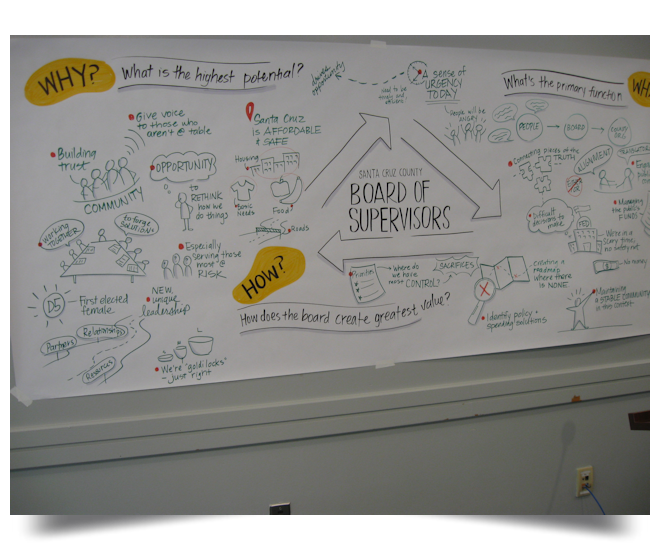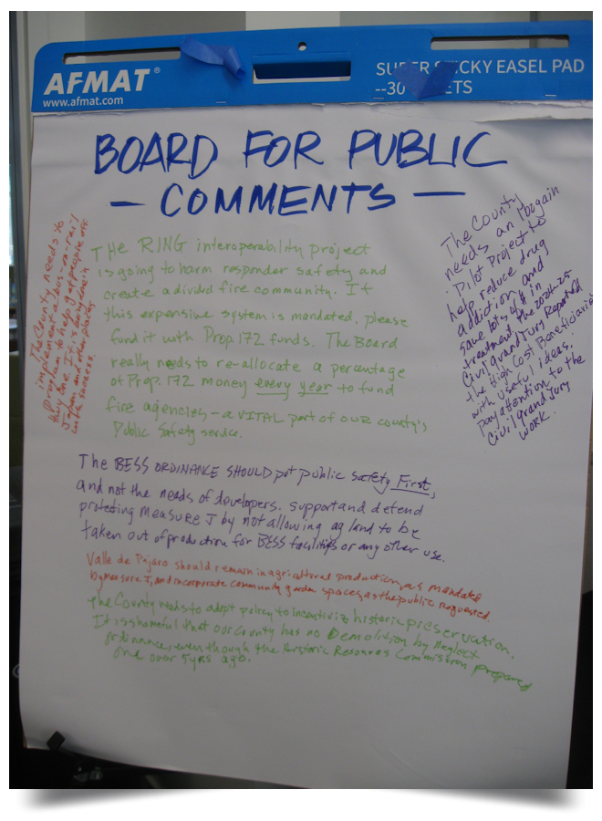 Imagine gathering all the high-level County Department Directors, all five County Supervisors and their staff and County Counsel in one spot for an entire day, while hiring a consultant from the east coast to facilitate a discussion about what it means to be a County Supervisor and distribute a flurry of sticky notes? That’s what happened at the January 30 Special Meeting of the Board of Supervisors, beginning at 9am and lasting until 3:30pm, to update the County’s Strategic Plan.